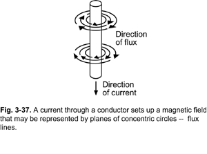 To understand arc blow, it is helpful to visualize a magnetic field. Figure 3-37 shows a DC current passing through a conductor (which could be an electrode or the plasma stream between an electrode and a weld joint). Surrounding the conductor a magnetic field, or flux, is set up with lines of force that can be represented by concentric circles in planes at right angle to the direction of the current. These circular lines of force diminish in intensity the farther they are from the electrical conductor.