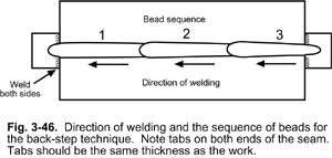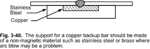 - Do not use a copper strip inserted in a steel bar for a backing, as in Figure 3-48. The steel part of the backup bar will increase arc blow