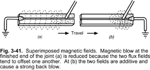 The combination of "squeezed" magnetic fluxes is illustrated in Figure 3-41(b).A workpiece connection at the finish of the weld, however, may be what the welder needs to reduce excessive forward blow at the start of the weld.