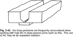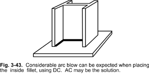 Where else is arc blow a problem? It is also encountered in the corners of fillet welds and in weld joints which use deep weld preparations. The cause is exactly the same as when welding a straight seam - concentrations of lines of magnetic flux and the movement of the arc to relieve such concentrations. Figures 3-42 and 3-43 illustrate situations in which arc blow with DC current is likely to be a problem.