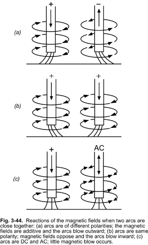 Usually, when two arcs are used, it is suggested that one be DC and the other AC, as shown in Figure 3-44(c).In this case, the flux field of the AC arc completely reverses for each cycle, and the effect on the DC field is small. As a result, very little arc blow occurs.