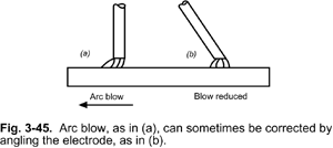- Angle the electrode with the work opposite the direction of arc blow, as illustrated in Figure 3-45