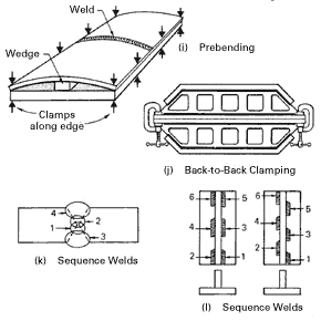 Prebending, presetting or prespringing the parts to be welded, Fig. 3-7(i), is a simple example of the use of opposing mechanical forces to counteract distortion due to welding. The top of the weld groove - which will contain the bulk of the weld metal - is lengthened when the plates are preset. Thus the completed weld is slightly longer than it would be if it had been made on the flat plate. When the clamps are released after welding, the plates return to the flat shape, allowing the weld to relieve its longitudinal shrinkage stresses by shortening to a straight line. The two actions coincide, and the welded plates assume the desired flatness.