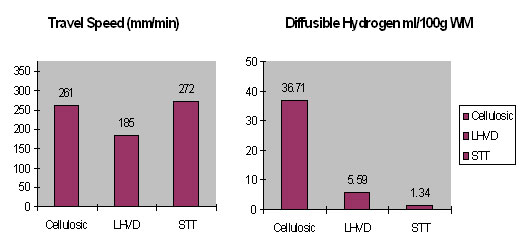 Hydrogen dissolves in the molten puddle during welding. Upon cooling, diffusable, as opposed to chemically bound, hydrogen can cause porosity during solidification and cracking in the finished weldment. This moisture originates primarily from the moisture and organic components. Attempts to adapt welding processes and procedures to X-80 and higher strength steels must be assessed. To take advantage of the pipe strength, the weld metal must either match the strength of the pipe or exceed it. The welding process and consumables must be controlled to minimize the risk of brittle fracture in the weld during pipeline fabrication and the resulting risk of hydrogen cracking. In addition, the demands of higher productivity