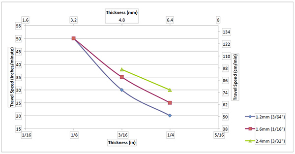 Naturally, for a given wire size there is a difference in maximum travel speed based on plate thickness. Thicker plates require a slower travel speed because the higher volume of material used in the operation requires more time and energy per unit length of weld.