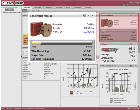 The system even can track welding wire consumable usage and change outs . The consumable type and package size for each welder can be set so the level of wire being consumed can be measured digitally. The monitoring system then will alert a designated individual or individuals, via email, when the wire supply is low.