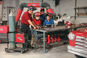 Many of the skills taught at WyoTech include a base concentration in welding. But before any student lays down a bead on a classic car, each must first prove proficient in the fundamentals of the trade. Students learn stick, TIG, MIG, and flux-cored welding on welding machines from Lincoln Electric.
