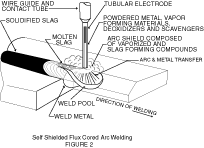 In shielded metal arc welding shielding is generated by the decomposition of the flux at the arc. In self shielded flux cored arc welding a continuous tubular electrode contains are stabilizers and core materials which will generate shielding when they reach the arc. Both processes work outside under severe weather conditions including temperature extremes and high winds. Likewise, both shielded metal arc welding with cellulosic electrodes and self shielded flux cored arc welding are easily learned by welding operators already skilled in other forms of shielded metal arc welding. For example, one instructor was recently able to train and qualify to API 1104 over ninety welding operators unfamiliar with self shielded flux cored arc welding.