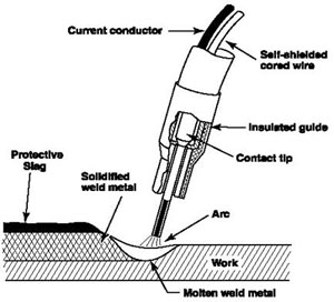 Self-shielded, flux-cored wires, commonly referred to as Innershield® wires, are often described as "a stick electrode that is inside out". Just like covered or stick electrodes, they rely solely on their slag system and the gases produced from chemical reactions in the arc to protect the molten metal from the atmosphere (see Figure 1). The flux ingredients in the core perform multiple functions, which include: 1) They deoxidize and denitrify the molten metal. 2) Forms a protective slag, which also shapes the bead and can hold molten metal out-of-position. 3) Adds alloying elements to the weld metal to produce desired mechanical properties. 4) Affects welding characteristics (i.e. deep penetration characteristics and high deposition rates).