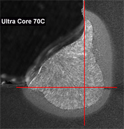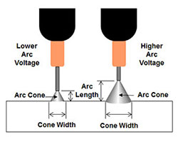 One main welding variable that has virtually no effect on weld penetration is arc voltage. While changes in arc voltage can result in minimal changes in weld penetration, the effect is very minor compared to welding current and the other variables just listed in this article. Arc voltage affects the arc length. At the same wire feed speed, as voltage increases, the arc length gets longer and as voltage decreases, the arc length gets shorter. The length of the arc in turn determines the width and size of the arc cone. As arc length decreases, the arc cone becomes narrower and the arc is more focused (see Figure 7). The result is a weld bead that is more narrow and ropy and the level of weld penetration may decrease very slightly. Conversely, as arc length increases, the arc cone becomes wider and the arc is broader. The result is a weld bead that is wider and flatter and the level of weld penetration may increase very slightly. The effect of arc voltage on the bead shape can clearly be seen in Figure 8. Notice also that a very slight difference in weld penetration can be detected between welds made at 27 volts, 34 volts and 45 volts (all at the same amperage, travel speed and diameter electrode). Realize however that this is an extremely large variation in arc voltage, done only on this weld sample to illustrate the point. Practically, arc voltage would only be varied by a few volts when welding. Therefore, the change in penetration caused by changing voltage (only) by just a few volts would virtually be nonexistent.