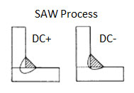 - Polarity: the type of welding polarity used affects penetration level. With most arc welding processes, DC+ (direct current electrode positive) polarity produces more weld penetration, because more arc energy is focused into the base plate. Conversely, DC- (direct current electrode negative) polarity produces less weld penetration, because more arc energy is focused into the electrode and not into the base plate. This is the case with the Shielded Metal Arc Welding (SMAW), Gas Metal Arc Welding (GMAW), Flux Cored Arc Welding (FCAW) and SAW processes (see figure 3). The exception is the Gas Tungsten Arc Welding (GTAW) process, in which the effect of polarity on penetration is opposite. With GTAW, DC- polarity results in more weld penetration (with DC+ polarity generally not used).