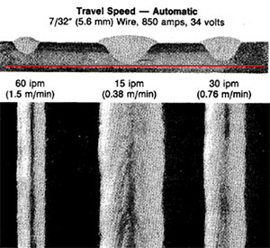 The welding variable that has the greatest effect on the degree of weld penetration is current (measured in amperage or amps). Quite simply, as welding current increases (i.e., more amperage), weld penetration increases and as welding current decreases (i.e., less amperage), weld penetration decreases. Figure 2 illustrates this point with three welds made at different current levels and where all other variables were held constant.