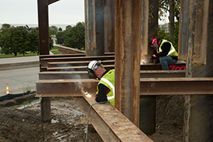 La soldadura es un componente clave del proyecto. Actualmente, el equipo de construcción está creando un sistema de excavación de apoyo conocido como muro combinado o combinado. Está compuesto por una serie de pilotes (pilotes de tubería de acero de 24 y 36 pulgadas de diámetro) y tablestacas de acero. Estas piezas se sueldan entre sí para crear un marco de transmisión de dos niveles.