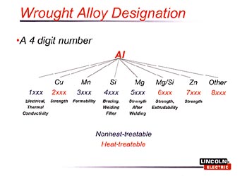 Para los propósitos de este artículo, discutiremos las aleaciones forjadas, que son aquellas aleaciones de aluminio que se laminan a partir de lingotes o se extruyen con formas especificadas por el cliente. Pero tenga en cuenta que las aleaciones también se pueden dividir en aleaciones fundidas. Las aleaciones fundidas son las que se utilizan para fabricar piezas a partir de aleaciones fundidas de aluminio vertidas en moldes. Las aleaciones fundidas se pueden endurecer por precipitación pero nunca por deformación. La soldabilidad de estas aleaciones se ve afectada por el tipo de fundición (molde permanente, fundición a presión y arena), ya que la superficie de fundición es fundamental para el éxito de la soldadura. Un número de tres dígitos más un decimal, es decir, 2xx.x designa las aleaciones fundidas. Los grados soldables de fundición de aluminio son 319.0, 355.0, 356.0, 443.0, 444.0, 520.0, 535.0, 710.0 y 712.0.