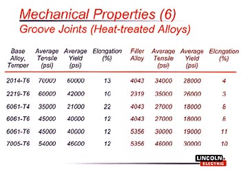 Las propiedades mecánicas como la resistencia a la tracción, el rendimiento y el alargamiento se ven afectadas por la elección de la base de aluminio y las aleaciones de relleno. Para soldaduras de ranura, la Zona Afectada por el Calor (ZAT) dicta la resistencia de la junta. En las aleaciones de aluminio no tratables térmicamente, la ZAT estará completamente recocida y la ZAT será el punto más débil. Las aleaciones tratables térmicamente requieren períodos mucho más largos a temperaturas de recocido combinadas con un enfriamiento lento para recocerlas por completo, de modo que la resistencia de la soldadura se vea menos afectada. Elementos como el precalentamiento, la falta de enfriamiento entre pasadas y la entrada de calor excesiva de las pasadas de soldadura de tejido lento aumentan la temperatura máxima y el tiempo a temperatura, lo que significa que es posible que no se cumplan los niveles mínimos de resistencia.