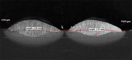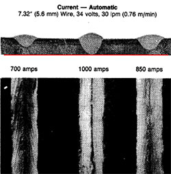 La variable de soldadura que tiene el mayor efecto sobre el grado de penetración de la soldadura es la corriente (medida en amperaje o amperios). En pocas palabras, a medida que aumenta la corriente de soldadura (es decir, más amperaje), la penetración de la soldadura aumenta y a medida que disminuye la corriente de soldadura (es decir, menos amperaje), la penetración de la soldadura disminuye. La Figura 2 ilustra este punto con tres soldaduras realizadas a diferentes niveles de corriente y donde todas las demás variables se mantuvieron constantes.