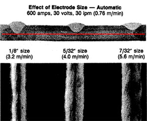 Diámetro del electrodo: cuando se suelda con dos diámetros diferentes del mismo electrodo y al mismo nivel de corriente, generalmente se logra más penetración con el electrodo de menor diámetro que con el electrodo de mayor diámetro (ver Figura 5). Si observa una sección final de cada tamaño de alambre, el diámetro más pequeño tiene menos área de sección transversal que el diámetro más grande. Como la misma cantidad de corriente fluye a través de cada electrodo, la concentración o densidad de corriente es mayor en el electrodo de menor diámetro que en el electrodo de mayor diámetro. Como resultado de esta mayor densidad de corriente, el electrodo de menor diámetro tendrá una mayor penetración de soldadura que el electrodo de mayor diámetro. Sin embargo, tenga en cuenta que cada diámetro de electrodo tiene una densidad de corriente máxima antes de que el arco de soldadura se vuelva muy inestable y errático. Entonces, cuando la corriente alcance un cierto nivel, será necesario aumentar el diámetro del electrodo.