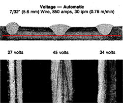 Una variable de soldadura principal que prácticamente no tiene ningún efecto sobre la penetración de la soldadura es el voltaje del arco. Si bien los cambios en el voltaje del arco pueden resultar en cambios mínimos en la penetración de la soldadura, el efecto es muy pequeño en comparación con la corriente de soldadura y las otras variables que se enumeran en este artículo. El voltaje del arco afecta la longitud del arco. A la misma velocidad de alimentación de alambre, a medida que aumenta el voltaje, la longitud del arco se hace más larga y, a medida que el voltaje disminuye, la longitud del arco se acorta. La longitud del arco a su vez determina el ancho y el tamaño del cono del arco. A medida que disminuye la longitud del arco, el cono del arco se vuelve más estrecho y el arco está más enfocado (ver Figura 7). El resultado es un cordón de soldadura que es más estrecho y espeso y el nivel de penetración de la soldadura puede disminuir muy levemente. Por el contrario, a medida que aumenta la longitud del arco, el cono del arco se ensancha y el arco es más ancho. El resultado es un cordón de soldadura que es más ancho y plano y el nivel de penetración de la soldadura puede aumentar muy levemente. El efecto del voltaje del arco en la forma del cordón se puede ver claramente en la Figura 8. Observe también que se puede detectar una diferencia muy leve en la penetración de la soldadura entre las soldaduras hechas a 27 voltios, 34 voltios y 45 voltios (todas al mismo amperaje, recorrido electrodo de velocidad y diámetro). Sin embargo, tenga en cuenta que esta es una variación extremadamente grande en el voltaje del arco, hecha solo en esta muestra de soldadura para ilustrar el punto. Prácticamente, el voltaje del arco solo variaría en unos pocos voltios al soldar. Por lo tanto, el cambio en la penetración causado por el cambio de voltaje (solo) en solo unos pocos voltios sería prácticamente inexistente.