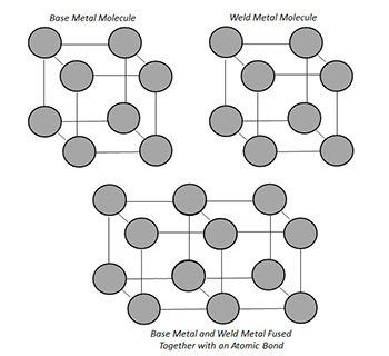 La soldadura por arco consiste en tomar dos o más piezas de metal separadas y unirlas en una sección continua u homogénea. Logras coalescencia, lo que significa mezclarse o unirse. En otras palabras, el propósito de la soldadura por arco es lograr la fusión entre las piezas de metal inicialmente separadas. La American Welding Society (AWS) define la fusión como "La fusión del metal de aportación y el metal base (sustrato), o solo del metal base, lo que da como resultado la coalescencia" (Términos y definiciones estándar de soldadura ANSI / AWS A3.0). La fusión ocurre cuando tienes enlaces atómicos de los metales. Las moléculas de cada pieza de metal separada y el metal de aportación se unen cuando tienes 1) limpieza atómica y 2) cercanía atómica (ver Figura 2). Esto ocurre con la soldadura por arco de manera que los átomos de cada pieza de metal se unen con electrones compartidos para convertirse en una pieza de metal sólida u homogénea.