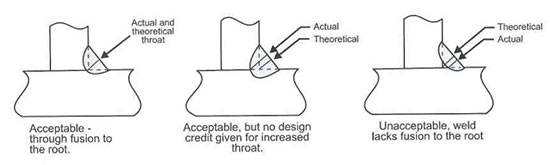 En este artículo se ha enfatizado la necesidad de lograr una fusión completa. Esto se debe a que puede surgir un problema si tiene una falta de fusión en cualquier parte de la articulación. Esto puede ser una discontinuidad con la fusión de la pared lateral, apropiadamente denominada penetración articular, o fusión en la raíz, apropiadamente denominada penetración radicular. La fusión incompleta puede convertirse en un área de defecto de soldadura, lo que puede afectar la resistencia de la soldadura y, en última instancia, provocar una falla en la soldadura. La Figura 5 muestra ejemplos de perfiles de soldadura aceptables e inaceptables.