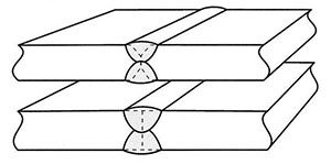 Beneficio: La Figura 6 muestra ejemplos de soldaduras de ranura CJP en una junta a tope con una dimensión de la cara de la raíz (es decir, el borde cuadrado o la parte no biselada de los bordes de la placa en una junta a tope). Estas uniones se soldarán desde el primer lado (con una o más pasadas, dependiendo del espesor de la placa). Luego, por lo general, la pieza soldada se voltea y se suelda desde el segundo lado (nuevamente, con una o más pasadas). Para lograr una penetración completa de la junta, las placas deben estar biseladas, como en la junta de doble V que se muestra en la imagen superior. O si se trata de una junta de borde cuadrado (que se muestra en la imagen inferior), luego de que se suelda el primer lado, el segundo lado de la junta debe primero perforarse hacia atrás para soldar el metal sano. Luego se suelda el segundo lado. Si se utilizaran procedimientos de soldadura que produjeran una penetración de soldadura más profunda, entonces la profundidad de los biseles de la junta no necesitaría ser tan profunda, lo que alargaría la cara de la raíz. O en el caso de los bordes cuadrados, no sería necesario quitar tanta placa base en el segundo lado mediante un desbaste trasero antes de alcanzar el metal de soldadura sólido. En cualquier caso, se reduciría el volumen de metal de soldadura necesario para rellenar la junta. Esto reduce tanto la cantidad de metal de aportación necesaria para rellenar la junta como el tiempo de soldadura. Menos soldadura también reduciría los posibles problemas de alabeo de la placa.
