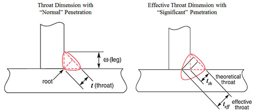 Beneficio: Para soldaduras de filete con una cara plana e incluso tamaños de pata, la distancia desde la cara de la soldadura hasta la raíz se denomina garganta teórica. Si logra la fusión más allá de la raíz, entonces la longitud de la garganta real o efectiva aumenta (consulte la Figura 3 para identificar las gargantas teórica y real). Por lo general, no se otorga ningún crédito de diseño de resistencia adicional a la soldadura por la penetración normal de la raíz. Sin embargo, si se puede lograr una penetración de la raíz significativa y constante, lo que aumenta significativamente la profundidad efectiva de la garganta, entonces el tamaño de la pata de filete se puede reducir sin sacrificar la resistencia de la soldadura (ver ejemplo en la Figura 7). Una penetración de soldadura más profunda no produce una soldadura de filete con más fuerza de soldadura. Más bien, permite realizar una soldadura de filete más pequeña con el mismo nivel de resistencia que una soldadura de filete más grande hecha con menos penetración de soldadura. Las soldaduras de filete más pequeñas disminuyen la cantidad de metal de soldadura necesaria e incluso pueden permitir mayores velocidades de desplazamiento. Este beneficio podría materializarse potencialmente mediante el uso del proceso de soldadura por arco sumergido (SAW), conocido por sus capacidades de penetración profunda. Otros procesos de soldadura por arco también pueden lograr una penetración profunda. Sin embargo, el taller de fabricación debe ser capaz de producir el nivel de penetración más profundo de manera consistente, por lo que este concepto puede no ser siempre aplicable. Este artículo de Welding Innovations del sitio web de la Fundación James F. Lincoln trata este tema con más detalle.