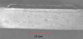 Además, en el caso de aplicaciones de revestimiento duro o superposición, una penetración más profunda puede diluir la química del depósito de soldadura y potencialmente disminuir sus propiedades de resistencia al desgaste resultantes. Las soldaduras superpuestas son simplemente soldaduras de "cordón sobre placa". La Figura 9 muestra una capa de soldadura con una penetración mínima y, por lo tanto, una mezcla mínima entre el metal de soldadura y la placa base. La Figura 10 muestra una soldadura de cordón sobre placa con una penetración más profunda y, por lo tanto, mucho más aditivo entre el metal de soldadura y la placa base.