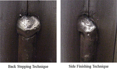 S'il est souhaitable de remplir le tuyau de cratère, quelques techniques de soudage de «remplissage de cratère» peuvent être utilisées pour ce faire. La méthode la plus efficace consiste à reculer ou à redescendre dans le cratère d'environ ½ "(12 mm) et à tenir pendant une seconde avant d'arrêter de souder. Une autre technique consiste à se placer sur le côté du cordon de soudure et à terminer sur le côté Pour les procédés de production de laitier, la deuxième méthode ne nécessite pas de souder à nouveau dans le laitier, mais elle conduit également à un cordon de soudure plus irrégulier qu'une technique à pas de retour rectiligne. La Figure 5 illustre ces deux techniques.