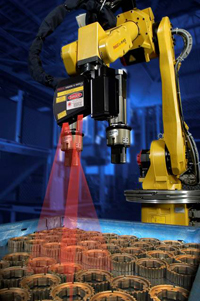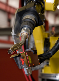 Laser Vision Tracking provides a three-dimensional real time method for tracking weld seams on material thickness less than 1 mm or joints with less than 1 mm gap. The laser sensor is attached to the robot arm approximately one inch ahead of the welding torch. A laser diode projects a line onto the part, and the camera detects the joint seam based on the distortion in the laser line. The camera’s software then provides feedback to the robot regarding gap and fit up variations. This data allows the robot to make necessary adjustments to torch position, travel speed, weave amplitude, and other weld parameters such as voltage and current. Laser Vision Tracking does not hamper overall travel speed, as weld speeds of 100ipm are still attainable. Since the laser operates on a single wavelength, it is not susceptible to interference from ambient light. Software algorithms that reduce noise and unwanted feedback also make it possible to use Laser Vision Tracking on shiny material such as aluminum and stainless steel. In addition, the camera is protected from weld spatter and fumes and intense heat by being mounted at the one inch look-ahead distance from the torch. The move from analog to digital technology greatly improved the capability of Laser Vision Tracking. Digital technology allows for the sensor to have a wider range and clearer signal. Compared to their analog counterparts, digital sensors are roughly four times more precise and have faster scanning rates. One of the main disadvantages still associated with Laser Vision Tracking is the cost of the system, which can be $50,000 or more. In addition, since the sensor is mounted to the torch, it can limit torch access in some applications.